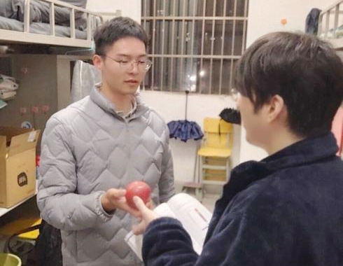 北斗学院辅导员深入宿舍,为考研学子送上寓意“平安顺利”的苹果,在寒夜里传递温暖与祝福,叮嘱同学们保重身体、轻装上阵,将学院的关怀转化为冲刺的动力。