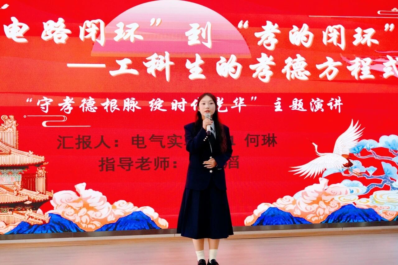 会计学院张梦寒从一通与爷爷的电话谈起,揭示孝是“爱”的传递与延伸,并结合志愿服务经历,倡导孝道应拓展至“不独亲其亲”的社会关爱。机械与电气工程学院何琳以工科思维巧妙比喻,将孝道喻为需精心维护的“电路闭环”,呼吁以专业技术实现爱的“双向传输”。外国语学院张静雯从“孝”字字形流变入手,分享父母深夜将自己抱回床铺的温暖记忆,阐明孝德蕴藏于生活细节的真心之中。
